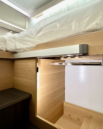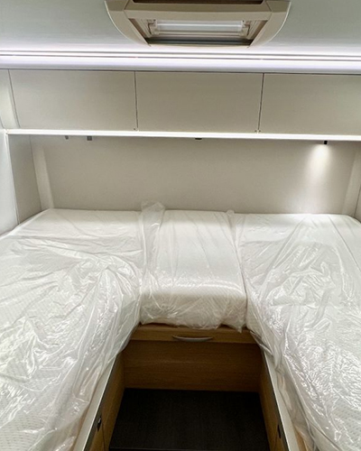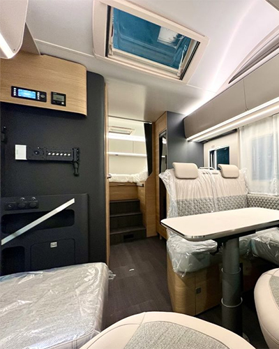 • Adria Coral XL 660 SL es una autocaravana capuchina espaciosa con distribución de camas gemelas traseras